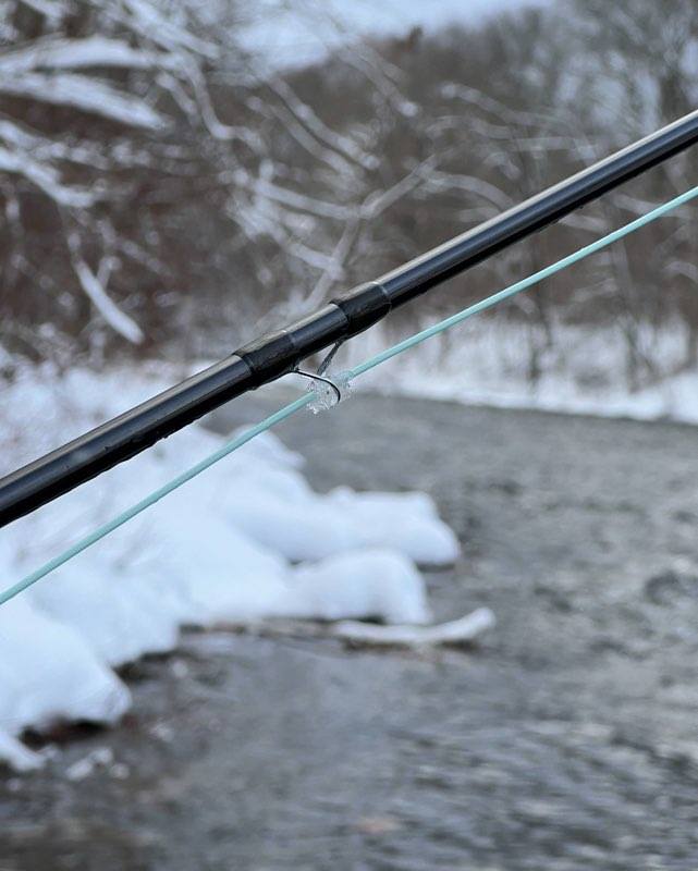 On the coldest days, ice forming in your guides is a massive pain. The colder the air temps, the quicker and more often this happens. Over the years I’ve seen a lot of different remedies to treat your guides to make them ice proof, such as putting chapstick or other water repelling substance on your guides. Though this might work for a little while, it will eventually fail and you are either back at square one or constantly reapplying to no avail. My solution to this is more related to the techniques I use rather than relying on temporary fixes. The real culprit for icy guides is pulling water through when retrieving line. Whether nymphing, dry fly fishing or streamer fishing, line retrieval is a huge part of many effective techniques.To work around this, I prefer to limit myself to presentations that use a fixed amount of line. This means I’m essentially never pulling water through my guides so the ice never forms to begin with. Doing this will limit you in some ways. For one, it will force you to fish at closer distances. For nymphing techniques, this is mostly not a problem, but you may simply need to skip over water that needs to be fished at a distance. For streamer fishing, this means you will rely more on rod tip movements to animate your fly instead of stripping line in. Once again distance will be a limiting factor. Using mono rigs over fly line is often ideal in these conditions, simply because less line is ever touching the water. If you carefully select your water types and stay disciplined, you can continue to fish even in very harsh conditions that turn many people away.