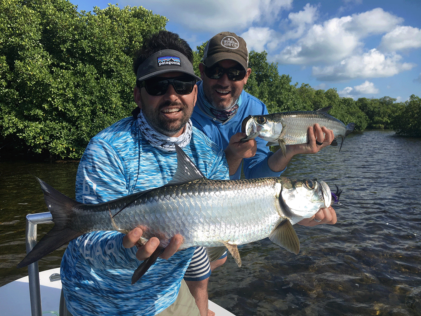I always have a wide assortment of tarpon flies that will cover most situations where tarpon are found. I like dark colors for clear water environments and I’m very partial to dark purple/black and red/back. The Puglusi Peanut Butter is probably my favorite overall pattern, in sizes 2/0 to 3/0. When I’m fishing mangrove estuaries for smaller fish where the waters are often stained and darker, I tend to use more white patterns with silver flash and my go to fly in these conditions is the old school, Blanton’s Whistler. I love this fly in dirty water! I will also always have different sizes of flies in my fly box, from small deceivers in size #2, up to large size 4/0 flies.  I always make sure I have some weighted flies in my box, in case I need to get down deep in a hurry. In most cases I’m fishing at or near the surface when tarpon fishing, but I’ve found situations in Southern Belize where we found the fish deep and they would not come up. I also like to use weighted tarpon flies when fishing Cuba’s Rio Hatiguanico for juvenile tarpon. What it really comes down to is this. The more fly pattern options and colors you have in your fly box, the more situations and conditions you are ready for.