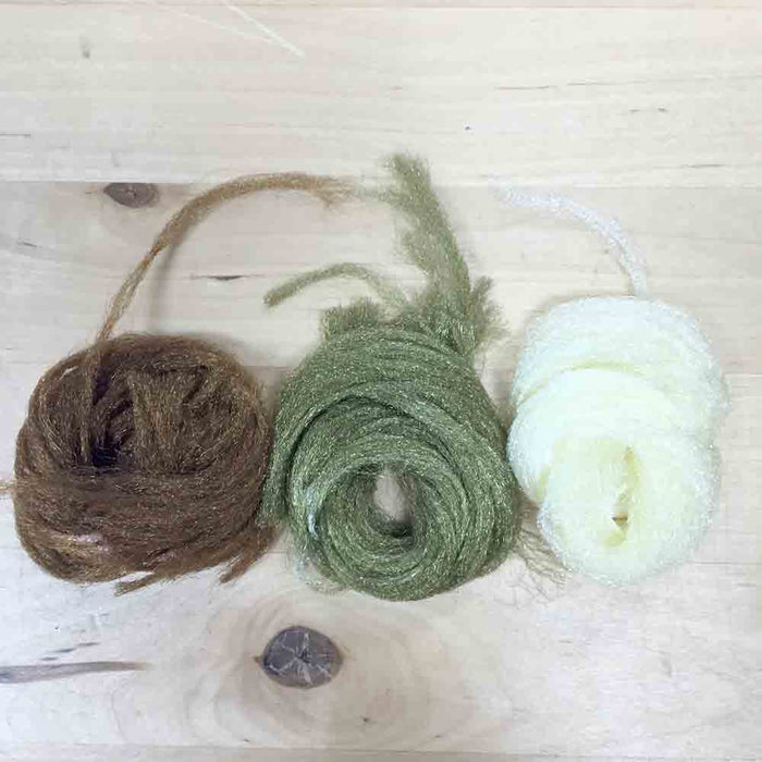 Kinky Z-lon is a synthetic material that has many uses. Very crinkly it can be used as wing material or as a very coarse dubbing. Makes nice emergent caddis pupae, shucks, tails, and wings.