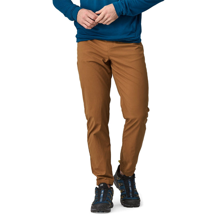 The classic Quandary Pants, now in a jogger silhouette. These multifunctional hiking pants are made of 96% NetPlus® postconsumer recycled nylon made from recycled fishing nets to help reduce ocean plastic pollution/4% spandex plain weave; with a durable water repellent (DWR) finish made without perfluorinated chemicals (PFCs/PFAS) to resist light moisture, and 40+ UPF sun protection. The inseam is 30".