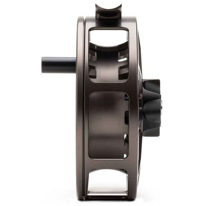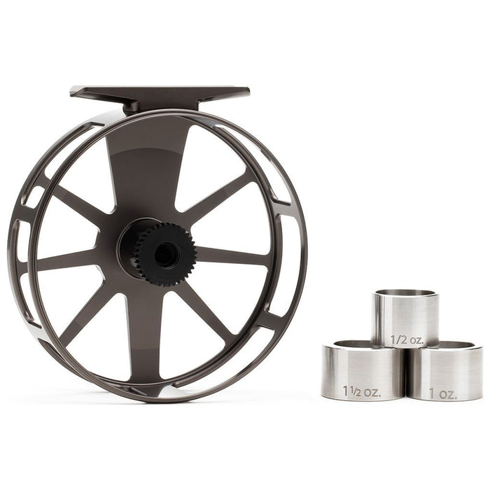 Eliminate variables to achieve balance. A Euro nymphing reel based on our Guru S platform, the E-Series emerges to strike the perfect balance between form and function. With a super-large arbor and narrow profile, everything on this reel is purposefully designed with Euro nymphing in mind including a new larger drag knob with precision clicks and a stealthy anodized finish. Straight mono or thin level lines are fully contained and encased in our HD full frame design. With lines protected and dimensions dialed, a streamlined weight system -- featuring 3 different weights (½ oz, 1 oz, 1-½ oz) -- enables you to precisely balance your reel with your rod.