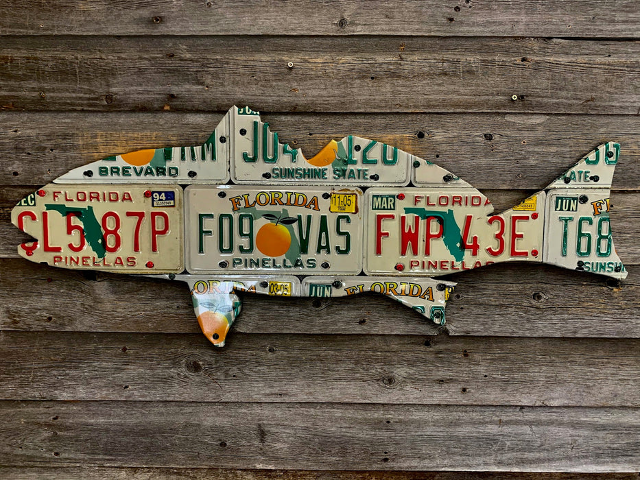 Bring home a little sunshine to your walls year-round with this fun redfish piece. Every license plate art piece is handmade and is unique. Yours will look very similar but will not be exactly the same as the photo example.