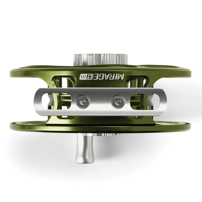 There are times when less is more—the new Mirage LT fly reel is everything its big brother is, but designed to balance perfectly with lighter rods and yet still offer legendary Mirage engineering and performance. Mirage LT features a lighter version of the sealed and maintenance-free carbon and stainless steel disc drag system that adjusts from zero to full drag in a single drag knob rotation. With zero start-up inertia and precise low-end control it eliminates line shock and protects light tippets with the same silky smooth drag, and yet offers more stopping power than you will ever need for trout, bass, pike, musky, or carp. 30% lighter and 30% narrower, the Mirage LT is made in New Hampshire by the same skilled American craftsmen that build the Mirage. The LT offers the same increased retrieve rates, reduction in line coil, and is machined from the same strong, yet lightweight, 6061 T6 aluminum barstock as the Mirage. Ergonomically designed, machined aluminum handle. Quick-release spool easily converts from left- to right-hand retrieve. Type II anodizing. Titanium shaft reduces weight and adds durable power transmission. Fully radiused reel foot prevents kinked leaders. Low-profile counterweight won't catch fingers or fly lines. In midnight with silver accents, olive with silver accents, and red/white/blue.