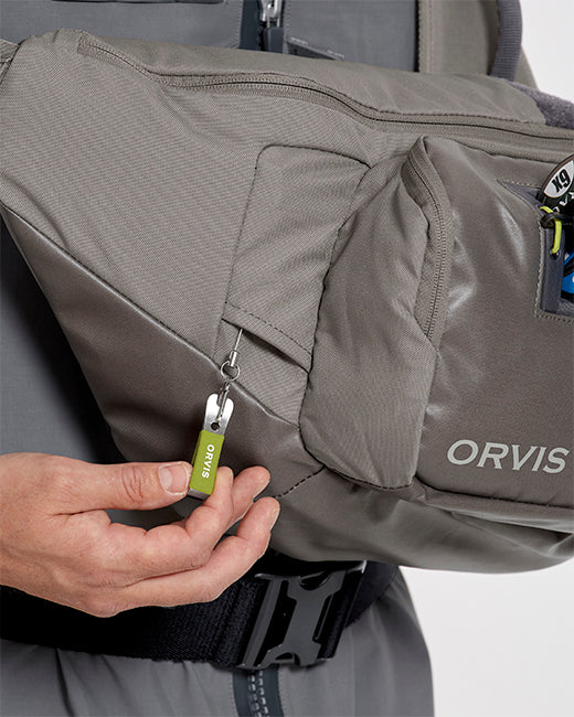 The best-selling Orvis fly-fishing Sling Pack has been updated and improved not only for durability, but with innovative new convenience features as well. The 100% recycled ECO CORDURA® platform is designed to store, organize, and offer easy, intuitive accessibility while staying completely out of your way when fishing. New features include the Tippet Whippet recessed docking station with tippet bar included for instant, fixed, and fumble-free access for up to six spools. Main compartment has zippered security pocket with key fob and stretch mesh pockets for small sort storage. Front drop-down has zippered pocket with elastic mesh slip pockets. Lo-pro zinger/nipper pass-through, easy swing handle, and water bottle holder with retainer. Front strap “dashboard” offers multiple docking stations for forceps and small tools as well as sliding adjustment for sternum strap. Left shoulder design frees up casting arm and shoulder. Weight: 500g/1.1 lbs. Shell: 100% recycled ECO CORDURA 600 denier polyester with strategic TPU coating. Liner: 100% recycled 200 denier polyester. Spot clean. Imported. Tippet and accessories not included.