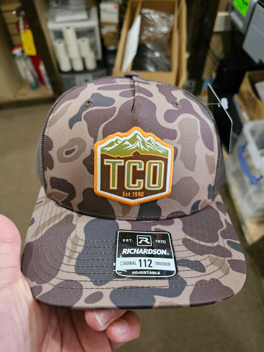 TCO Fly Shop Hat Crest Logo - Printed 5 Panel Trucker Camo