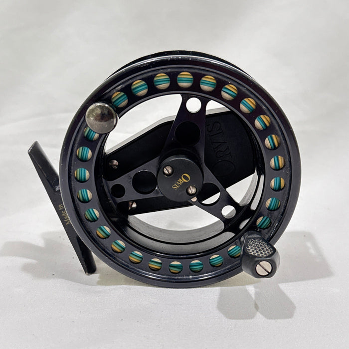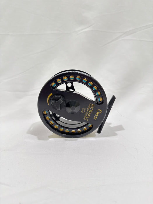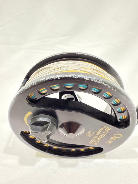 This Orvis Battenkill Large Arbor reel has been fished and shows it. Expect scratches are wear on the edges. The reel and drag function perfectly. Comes with a used SA Amplitude Trout WF5F line. The reel is set up left hand retrieve can be easily changed.