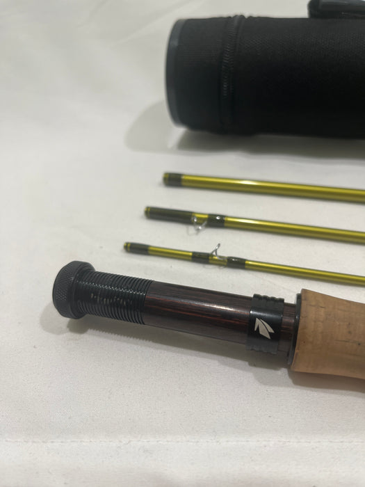This Sage Pulse is a great rod for throwing dry flies at trout on those smaller streams. This rod has seen its fare share of use but is still in good condition. The cork has a small section missing from the top but will not affect the fishability of this rod. The blank is in great condition, no blemishes or scratches to note.